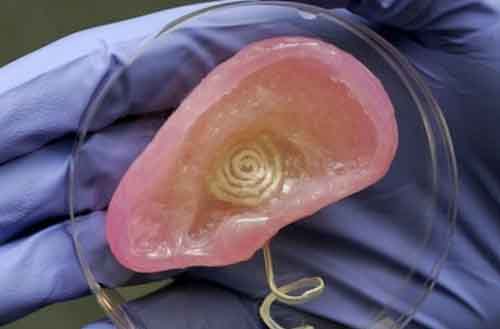 普林斯頓大學的一個納米科學家小組通過3D打印技術打印出了一只仿生耳朵,把電子元件和生物材料結合到一起,用靈活柔軟的3D打印耳朵來代替傳統的機器假耳朵。