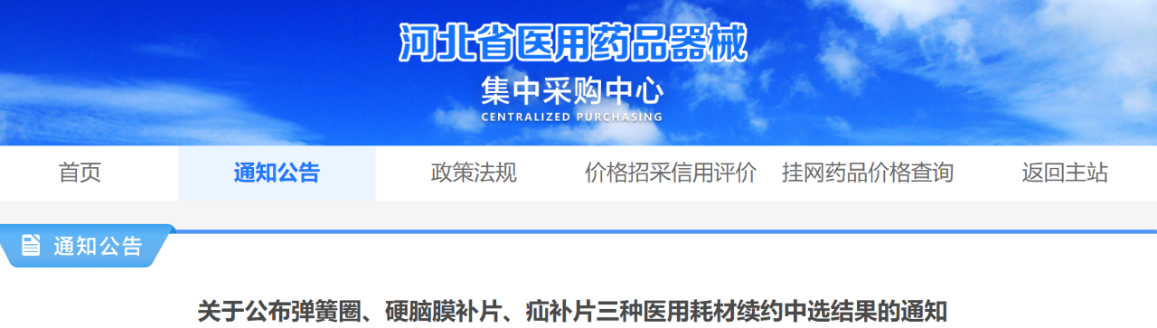 1月26日,河北省醫用藥品器械集中采購中心發布《關于公布彈簧圈、硬腦膜補片、疝補片三種醫用耗材續約中選結果的通知》。