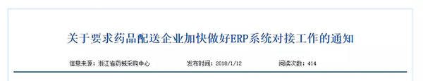 1月2日,浙江省藥械采購(gòu)平臺(tái)發(fā)布《關(guān)于要求藥品配送企業(yè)加快做好ERP系統(tǒng)對(duì)接工作的通知》(以下簡(jiǎn)稱《通知》)。