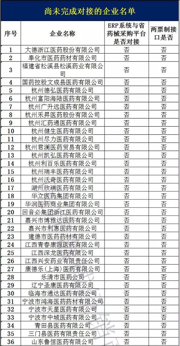 看了一下未與浙江省藥械采購(gòu)平臺(tái)完成ERP系統(tǒng)的對(duì)接工作的配送企業(yè)名單中,國(guó)藥、九州通、華潤(rùn)等均在列,共161家企業(yè)。