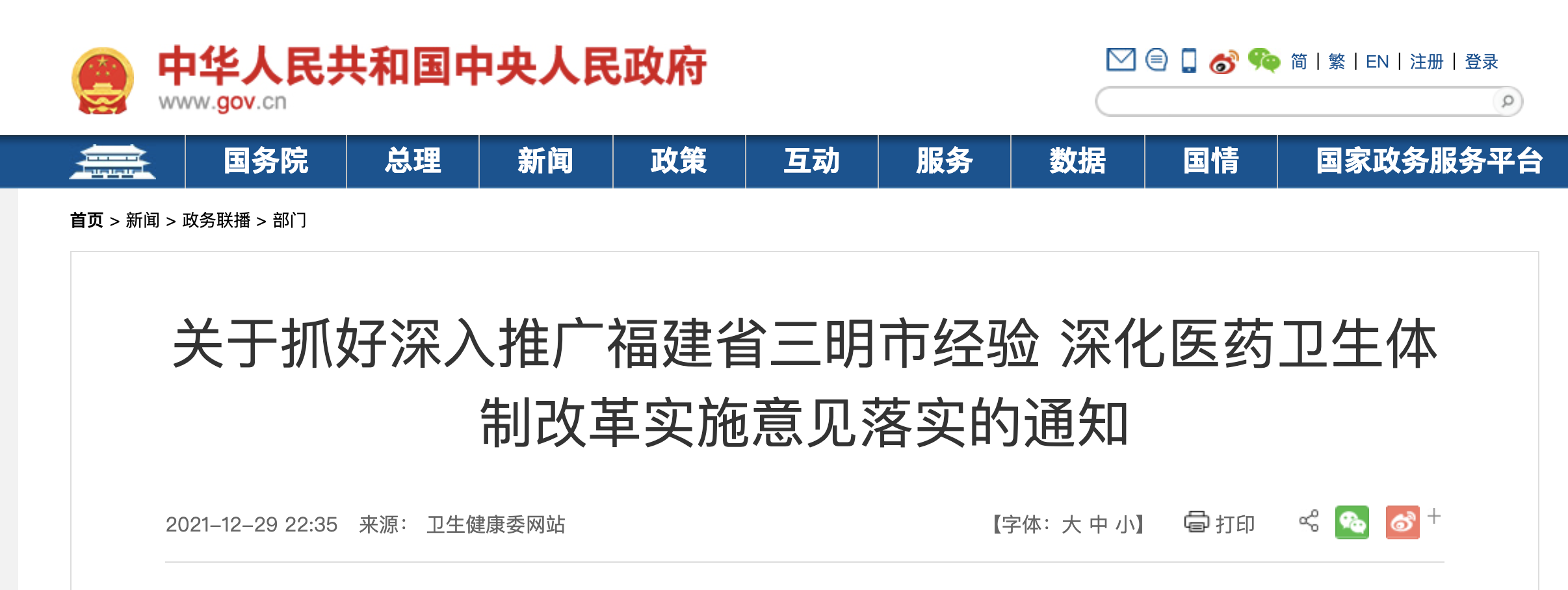 12月29日,國務院醫改領導小組秘書處發布《關于抓好深入推廣福建省三明市經驗 深化醫藥衛生體制改革實施意見落實的通知》(以下簡稱《通知》),并發布《深入推廣三明醫改經驗監測評價指標體系》(以下簡稱《體系》)。