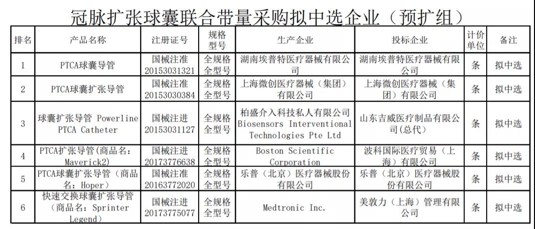 后擴組冠脈擴張球囊擬中選企業包括湖南埃普特、賽諾醫療、上海微創、波科、樂普、雅培。