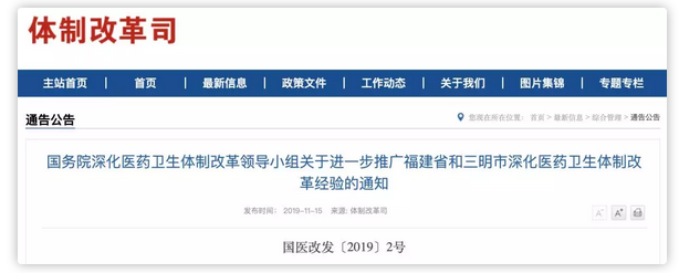 11月15日,國務(wù)院深化醫(yī)藥衛(wèi)生體制改革領(lǐng)導(dǎo)小組下發(fā)《關(guān)于進一步推廣福建省和三明市深化醫(yī)藥衛(wèi)生體制改革經(jīng)驗的通知》(以下簡稱“通知”)釋放重大信號。