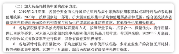 2020年,按照國家統(tǒng)一部署,擴大國家組織集中采購和使用藥品品種范圍。綜合醫(yī)改試點省份要率先推進由醫(yī)保經(jīng)辦機構(gòu)直接與藥品生產(chǎn)或流通企業(yè)結(jié)算貨款,其他省份也要積極探索。
