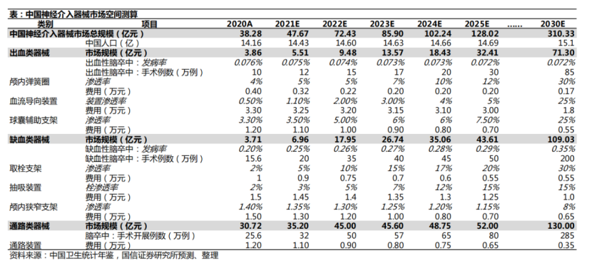 以神經介入市場為例,國信證券研究報告顯示,預計2030年中國神經介入醫療器械市場總規模將達到310億元。其中,出血類器械71億元、缺血類器械109億元,通路類器械130億元,比2025年均有翻倍以上增長。