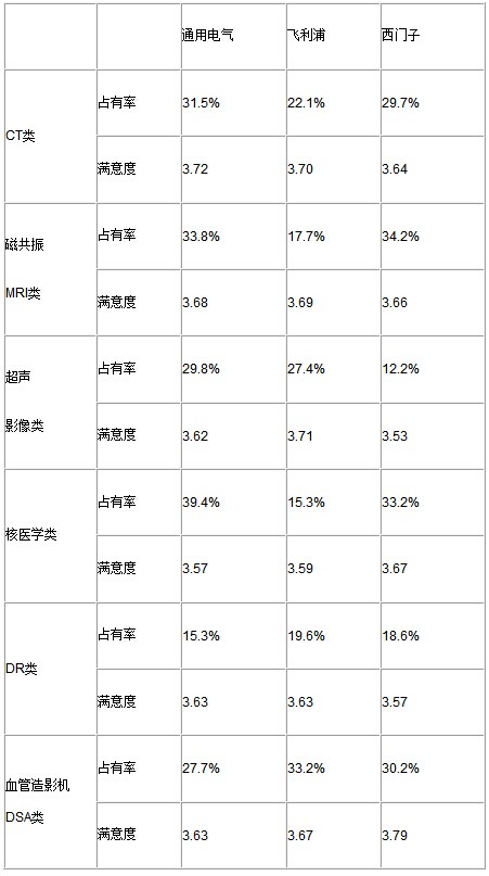 大型影像設備類,傳統三巨頭“GPS”(通用電氣、飛利浦、西門子的簡稱)在滿意度方面相差不大,在市場占有率方面各有優劣,互有勝場,但就總體而言,三家巨頭依然牢牢占據前三。