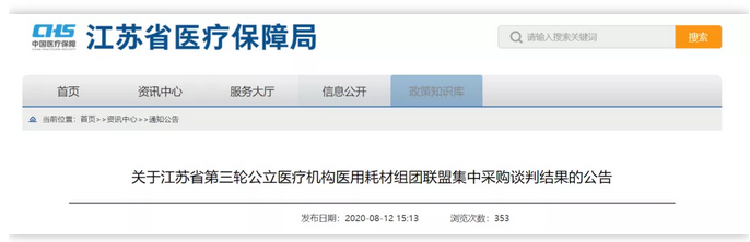 6月30日,江蘇省醫(yī)保局發(fā)布《江蘇省第三輪公立醫(yī)療機(jī)構(gòu)醫(yī)用耗材組團(tuán)聯(lián)盟集中采購(gòu)方案》顯示,本次約定采購(gòu)總量為省平臺(tái)2019年采購(gòu)總量的70%,采購(gòu)周期原則上為2年。