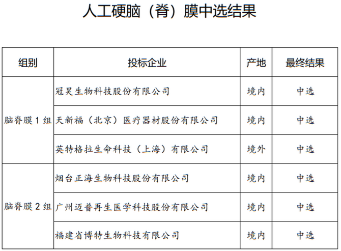 人工硬腦(脊)膜中選企業(yè)包括冠昊生物、天新福(北京)醫(yī)療器材、英特格拉生命科技等械企;