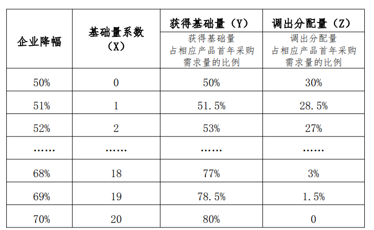 第一步:根據(jù)中選企業(yè)降幅不同,確定對(duì)應(yīng)的獲得基礎(chǔ)量和調(diào)出分配量。