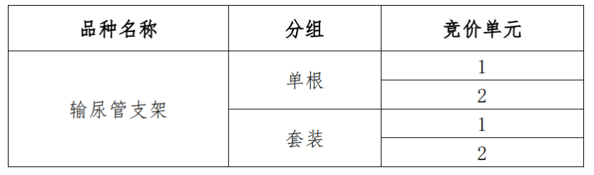 輸尿管支架按照單根、套裝進(jìn)行分組,將同一分組下同一申報(bào)企業(yè)所有申報(bào)產(chǎn)品的醫(yī)療機(jī)構(gòu)采購(gòu)需求量加總求和后,按照從大到小依次排序,根據(jù)下列規(guī)則劃分為2個(gè)競(jìng)價(jià)單元(具體競(jìng)價(jià)單元?jiǎng)澐智闆r將根據(jù)工作流程在相應(yīng)階段公布):