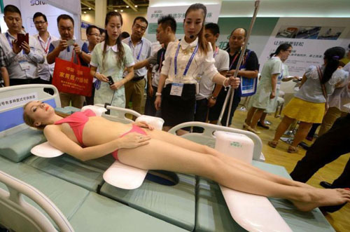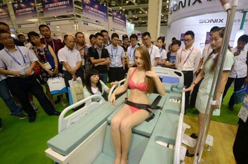 8月29日,一位西洋美女模特扮演“病人”,配合工作人員展示一款多功能護理床,吸引了眾多展會觀眾駐足觀看。