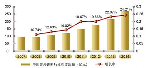 中國的體外診斷試劑行業已經具備了一定的市場規模和基礎,正從產業導入期步入成長期,該市場的發展前景良好。2007年到2014年,中國體外診斷市場規模增速顯著高于全球的平均水平,目前,進口試劑以及診斷儀器的壟斷優勢正在被民族產品打破和制約,中國體外診斷試劑產業發展總體表現出的特點是市場大,市場潛力更大。