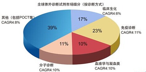 體外診斷試劑包含血液、生化、免疫、分子生物、細菌、POCT等幾大方面。從全球體外診斷試劑市場按照診斷方式細分,免疫診斷,臨床生化診斷以及分子診斷占據前三,發達國家的臨床生化診斷和免疫診斷市場已經接近成熟,而POCT和分子診斷是診斷市場的主要增長點。中國的免疫診斷試劑,臨床生化診斷試劑是最主要的兩大體外診斷試劑市場。