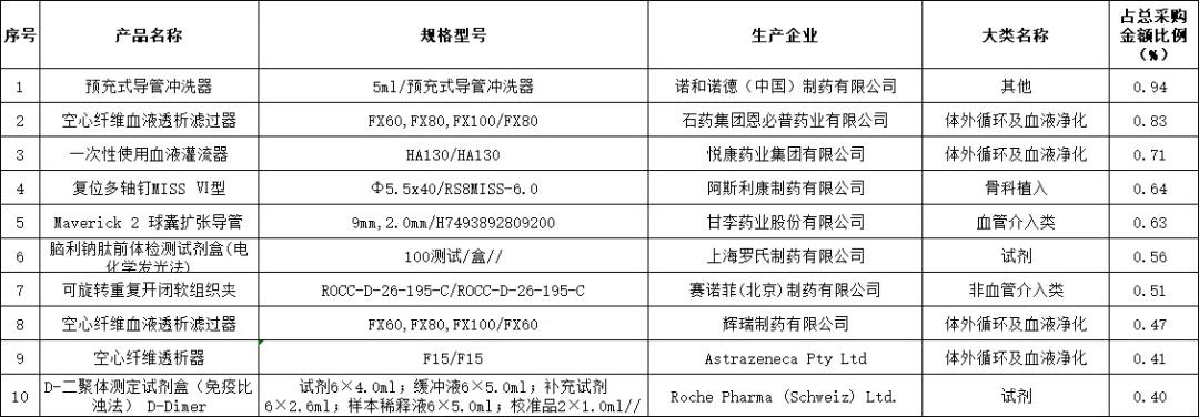 其中醫用耗材網上采購金額排名前10位如下表所示,合計金額為0.14億元,占醫用耗材總采購金額6.11%。