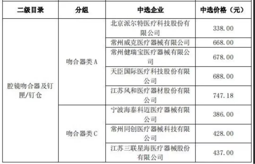 另外,在此之前,開放吻合器(重慶、云南、貴州和河南四省聯(lián)盟)也僅開展過一次集采。這也成為了進口品牌仍占據(jù)主流市場形勢下的一次腔鏡吻合器的快速集采落地,而其時可預見的價格下跌不禁讓許多人輾轉反側、五味雜陳。最終,2021年8月13日《湖南省2020年度醫(yī)療機構部分醫(yī)用耗材集中帶量采購中選結果》正式發(fā)布。 同臺角逐之下,本輪集采并沒有對進口品牌網(wǎng)開一面,其所在的B組全體落選。A組5個腔鏡吻合器中選企業(yè)名單出爐,全部價格最終呈現(xiàn)出斷崖式下跌。不過,各中標價之間也存在著較為懸殊的差距,從北京派爾特的最低價338元,到江蘇風和的最高價747元,其中相差了400多元。 此次湖南省集中采購的落地,除了讓行業(yè)關注者真切感受到集采的勢不可擋,也引起了更多的思考:集采或已成為腔鏡吻合器的未來趨勢,局中人該何去何從?同時,大幅度的價格下降,也為其他省份的集采提供了有利參考。或許,此次湖南省腔鏡吻合器的集采價格,將會成為其他省份腔鏡吻合器集采價格的天花板。因此,江蘇風和的747元中標價預測也將無法被突破。腔鏡吻合器進入了低千元時代!