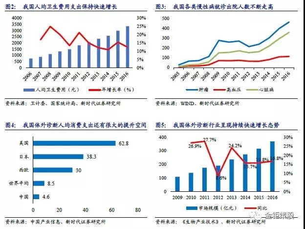可以看到我國人均衛(wèi)生費(fèi)用支出保持持續(xù)快速增長,各類慢性病(腫瘤、心臟病、高血壓等)的出院人次也是迭創(chuàng)新高。目前我國的診斷滲透率還比較低,從整體體外診斷人均消費(fèi)來看,我國人均體外診斷消費(fèi)金額僅4.6美元,相較全球平均水平8.5美元還有較大的差異,和發(fā)達(dá)國家歐美日等相比更是還有十倍的差距。我國體外診斷行業(yè)過去幾年已經(jīng)取得了快速的發(fā)展,行業(yè)規(guī)模從2009年的108億增長到了2016年的369億,年均復(fù)合增長率高達(dá)16.6%。未來隨著人口老齡化的加劇,人均醫(yī)療費(fèi)用支出的增長以及技術(shù)的進(jìn)步,我國體外診斷行業(yè)未來5年都有望保持持續(xù)快速發(fā)展,千億市場值得期待。
