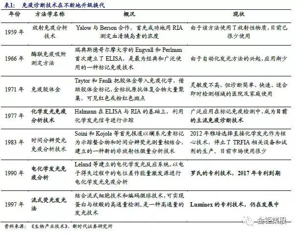 化學(xué)發(fā)光快速取代酶聯(lián)免疫,已成為免疫診斷主導(dǎo)技術(shù)平臺。免疫診斷領(lǐng)域的技術(shù)歷經(jīng)了多個發(fā)展階段,從放射免疫、酶聯(lián)免疫、免疫膠體金到化學(xué)發(fā)光技術(shù)、電化學(xué)發(fā)光、流式熒光技術(shù)等。化學(xué)發(fā)光憑借其靈敏度高、特異性好、自動化程度高、精密度好、準(zhǔn)確率高等優(yōu)勢在臨床應(yīng)用中迅速推廣,快速實現(xiàn)了對酶聯(lián)免疫的替代,目前已經(jīng)成為免疫定量分析領(lǐng)域的主流技術(shù),占據(jù)了超過70%的市場份額。