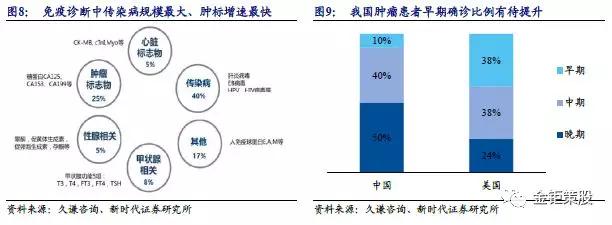 傳染病規(guī)模最大,腫瘤標(biāo)志物增速最快,國產(chǎn)企業(yè)技術(shù)突破首選的兩大方向。免疫診斷常見應(yīng)用領(lǐng)域有傳染病、腫瘤標(biāo)志物、性腺、心臟標(biāo)志物、甲狀腺等等,其中傳染病和腫瘤標(biāo)志物規(guī)模較大,分別占據(jù)了40%和25%的比例。傳染病檢測規(guī)模最大,而腫瘤標(biāo)志物檢測則增速更快,更具增長潛力。