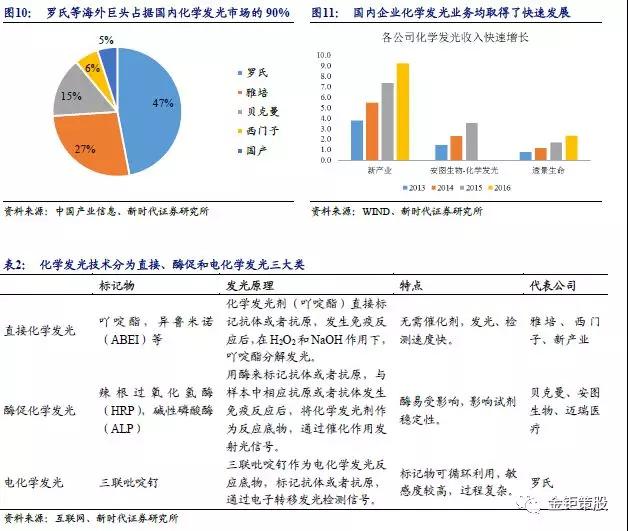 國內(nèi)化學(xué)發(fā)光龍頭,率先實現(xiàn)技術(shù)突破,先發(fā)優(yōu)勢顯著。新產(chǎn)業(yè)自成立以來一直專注于直接化學(xué)發(fā)光免疫儀器和體外診斷試劑。在突破化學(xué)發(fā)光關(guān)鍵技術(shù)上做到了全國多個第一:第一家推出國產(chǎn)化學(xué)發(fā)光免疫分析儀、第一家突破納米磁微粒分離技術(shù)、第一家采用“人工合成的小分子有機(jī)化合物”代替?zhèn)鹘y(tǒng)的酶作為發(fā)光標(biāo)記物。