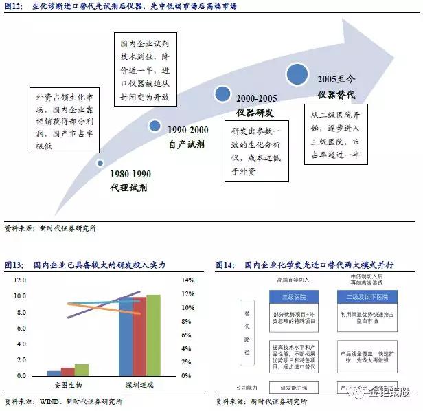 生化診斷發(fā)展早,試劑進(jìn)口替代率已超60%。生化診斷也經(jīng)歷了從外資壟斷向國內(nèi)主導(dǎo)的進(jìn)口替代發(fā)展歷程。80-90年代外資即進(jìn)入了中國占據(jù)了國內(nèi)市場,國內(nèi)企業(yè)技術(shù)基礎(chǔ)差只能通過經(jīng)銷外資產(chǎn)品來獲取收益,國內(nèi)生化市場基本被外資壟斷。由于生化診斷儀器和試劑的封閉性相對不強(qiáng),國內(nèi)企業(yè)通過技術(shù)研發(fā)開發(fā)出了相應(yīng)的試劑從而開啟了進(jìn)口替代的進(jìn)程。