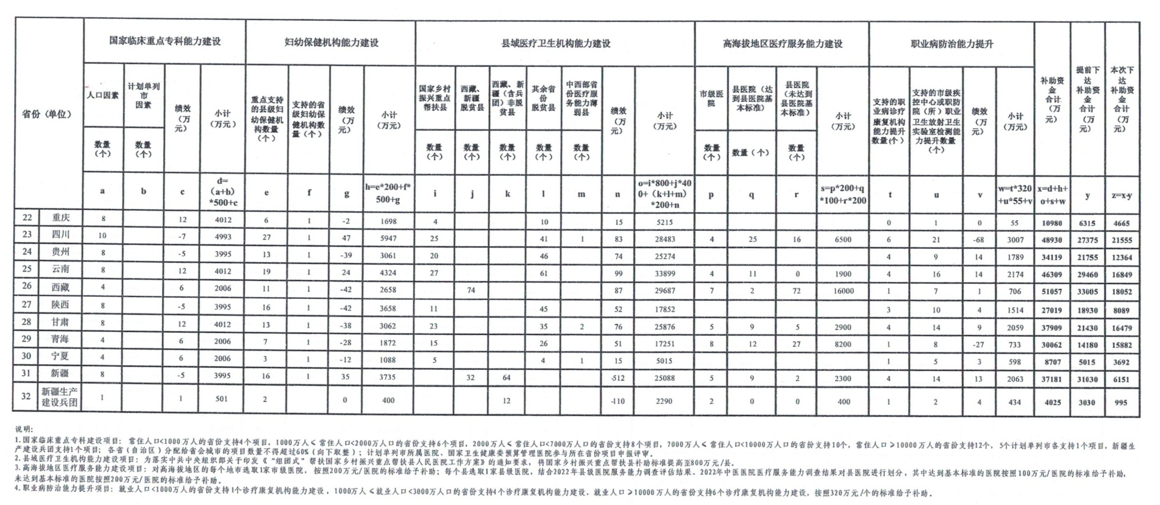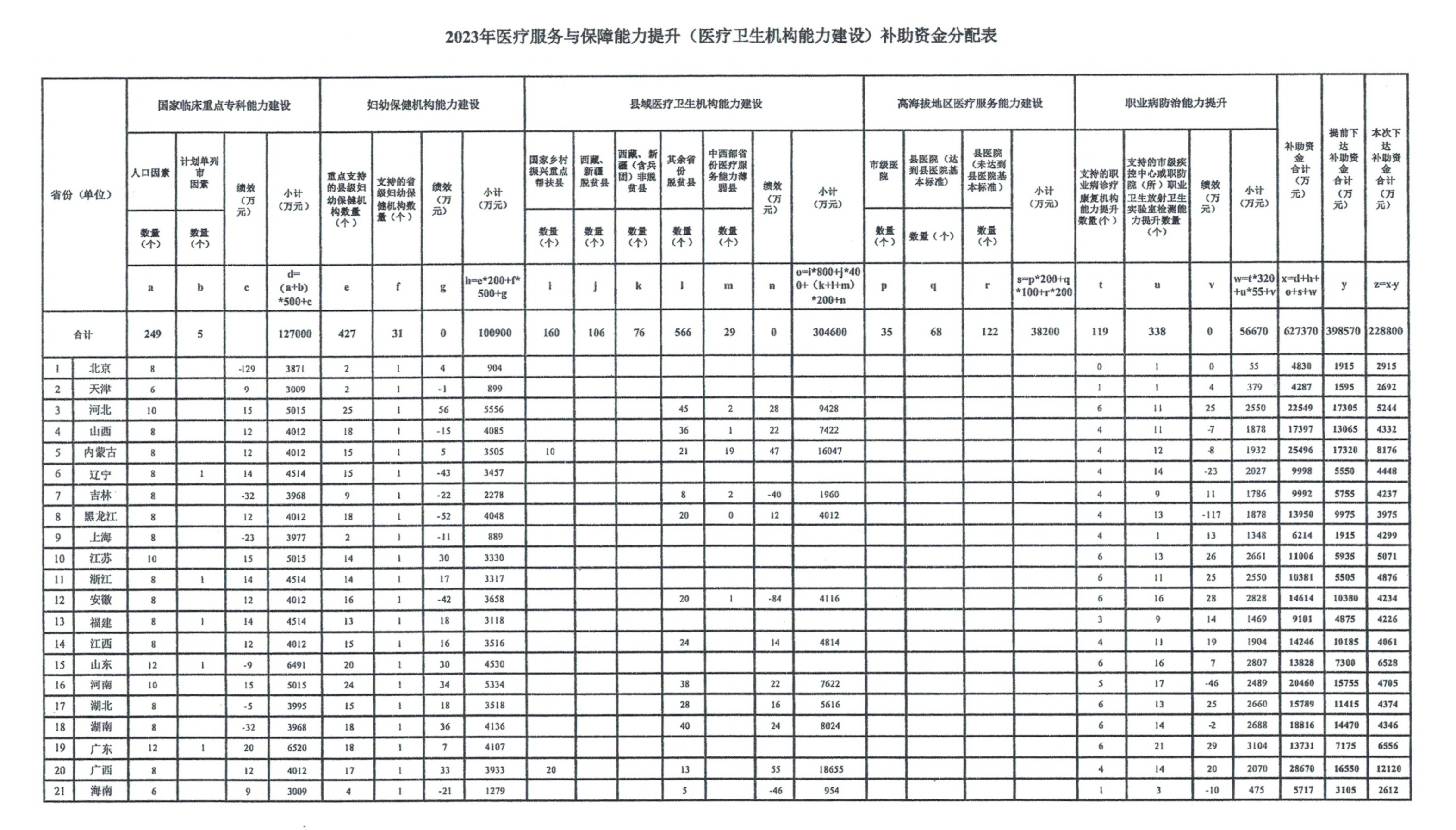2023年醫療服務與保障能力提升(公立醫院綜合改革)補助資金 (第二批)分配表顯示,此次下達補助資金預算總計30億元,每個地區2億元。