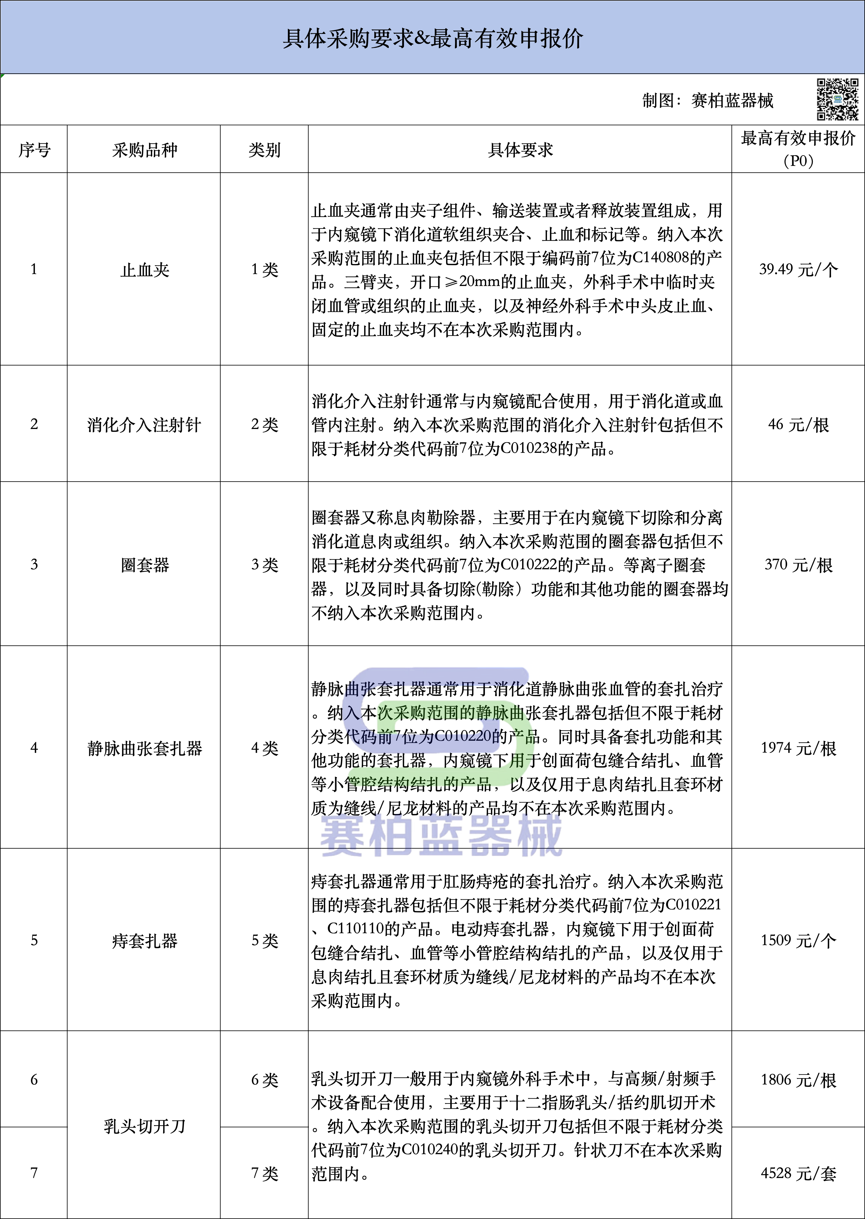 根據(jù)《公告》,此次采購(gòu)品種包括:止血夾、消化介入注射針、圈套器、靜脈曲張?zhí)自鳌⒅烫自鳌⑷轭^切開刀這6大品種(7大類別),并公布各自的最高有效申報(bào)價(jià)格,具體如下: