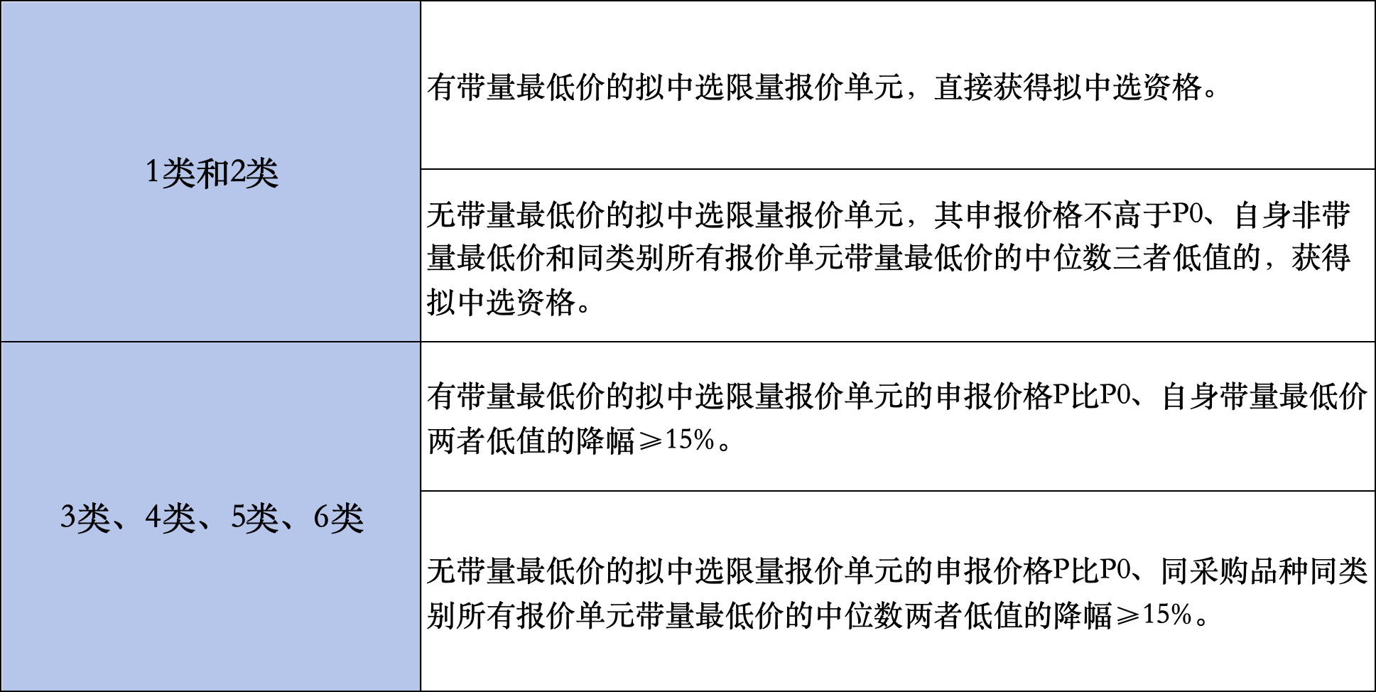 其中,(1類、2類)和(3類、4類、5類、6類)按規(guī)則一未獲得擬中選資格的,滿足各自相應(yīng)條件也將獲得擬中選資格,具體如下:
