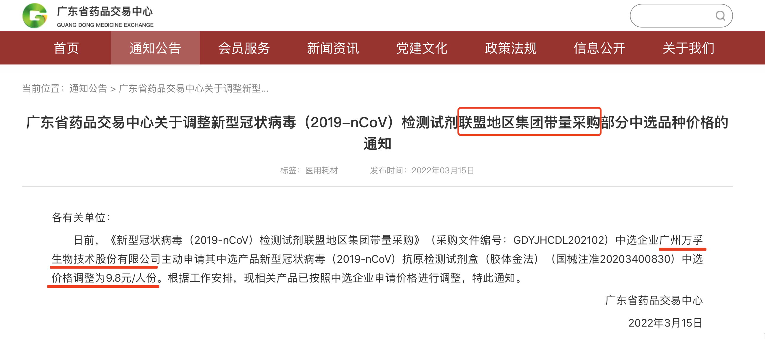 3月15日,廣東省藥品交易中心發布《關于調整新型冠狀病毒(2019-nCoV)檢測試劑聯盟地區集團帶量采購部分中選品種價格的通知》。需要注意的是,中選企業廣州萬孚生物技術股份有限公司主動申請其中選產品新型冠狀病毒(2019-nCoV)抗原檢測試劑盒(膠體金法)(國械注準20203400830)中選價格調整為9.8元/人份。