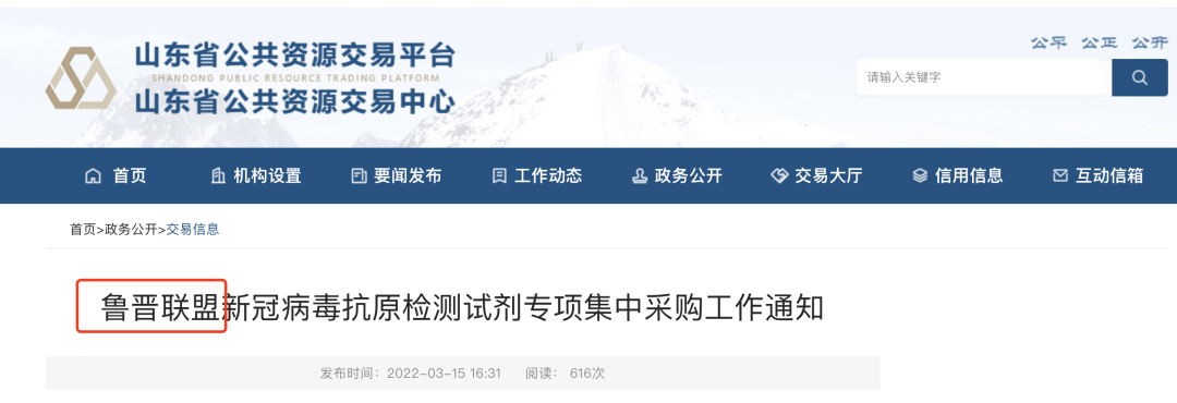 3月15日,山東省公共資源交易中心發布《魯晉聯盟新冠病毒抗原檢測試劑專項集中采購工作通知》,山東省、山西省組成聯盟(簡稱魯晉聯盟),開展新冠病毒抗原檢測試劑產品專項集中采購工作。采購主體是:符合新冠病毒抗原檢測要求的醫療機構。