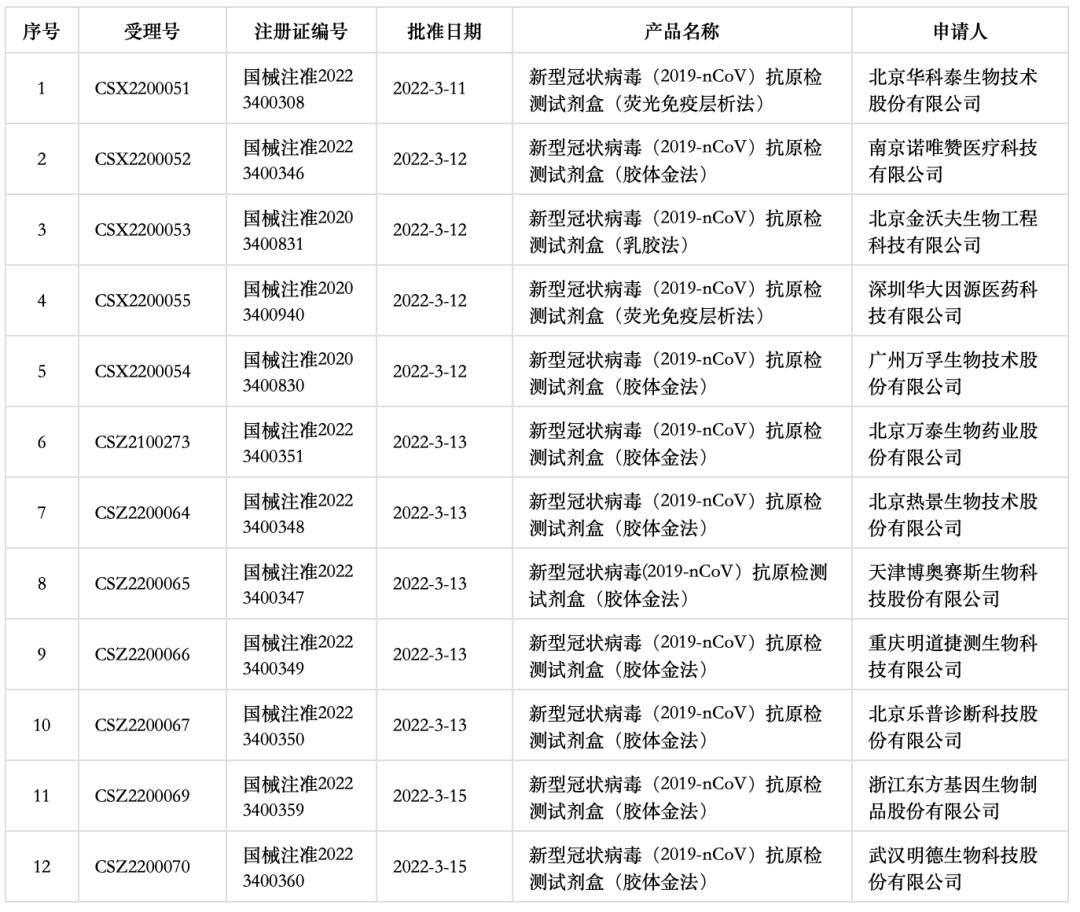 3月11日-13日,國家藥品監督管理局醫療器械技術審評中心完成10個新冠抗原檢測產品應急審評,3月15日又完成2個新冠抗原檢測產品的應急審評工作,并獲得國家藥監局審批。
