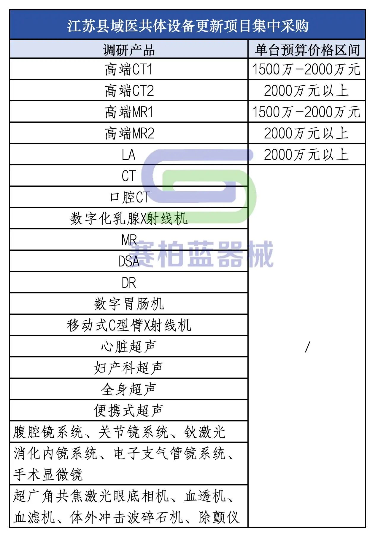 今年以來,江蘇省還對高端CT、高端MR和LA,以及腹腔鏡系統(tǒng)、關(guān)節(jié)鏡系統(tǒng)、鈥激光、消化內(nèi)鏡系統(tǒng)、電子支氣管鏡系統(tǒng)、手術(shù)顯微鏡、超廣角共焦激光眼底相機(jī)、血透機(jī)、血濾機(jī)、體外沖擊波碎石機(jī)、除顫儀等設(shè)備開展了集中采購調(diào)研。