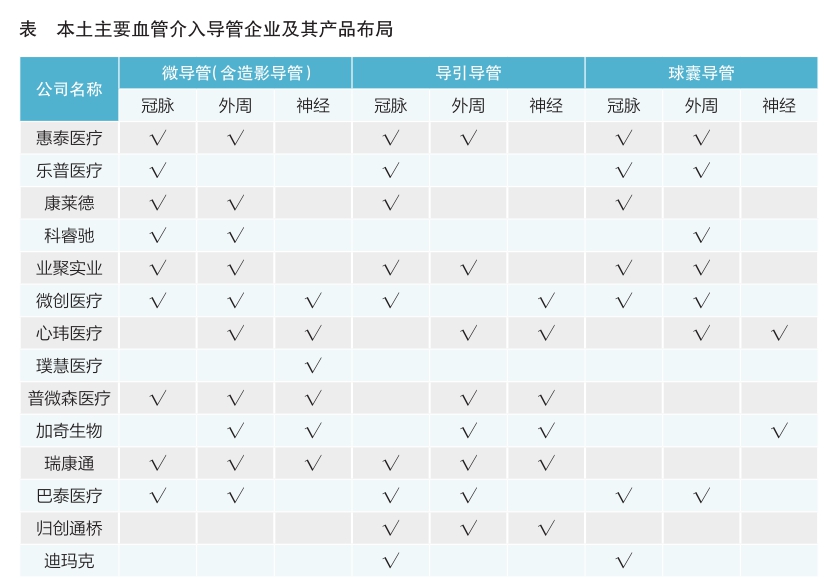 國(guó)內(nèi)企業(yè)中,微創(chuàng)醫(yī)療(含下屬企業(yè))的血管介入導(dǎo)管產(chǎn)品布局較為全面,覆蓋冠脈介入、外周血管介入、神經(jīng)血管介入等各個(gè)領(lǐng)域;惠泰醫(yī)療、業(yè)聚實(shí)業(yè)、巴泰醫(yī)療等企業(yè)在冠脈介入、外周血管介入治療領(lǐng)域有較全面的產(chǎn)品布局;心瑋醫(yī)療在外周血管介入、神經(jīng)血管介入領(lǐng)域的布局較為全面;樂普醫(yī)療、康德萊主要在冠脈介入領(lǐng)域布局(詳見表)。