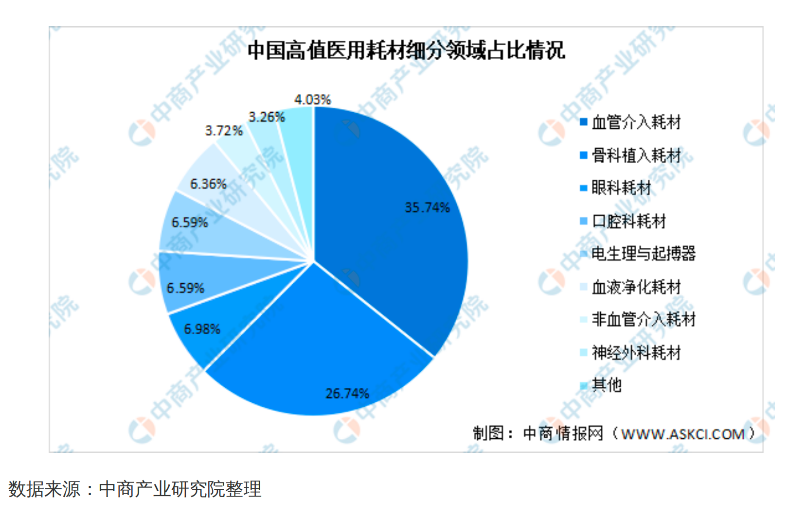 據中商產業研究院統計,高值醫用耗材細分市場中,2019年血管介入耗材規模為461億元,占比35.74%,是占比最高的細分市場。