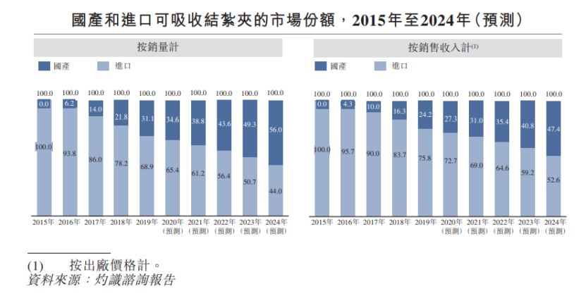 據(jù)灼識咨詢報告,預(yù)計到2024年中國結(jié)扎夾市場規(guī)模將達(dá)到40.86億元,其中高分子結(jié)扎夾市場規(guī)模28.33億元,2020-2024年復(fù)合增長率達(dá)25.2%,可吸收結(jié)扎夾市場規(guī)模12.53億元,2020-2024年復(fù)合增長率達(dá)29.2%。國產(chǎn)替代趨勢較為明顯。