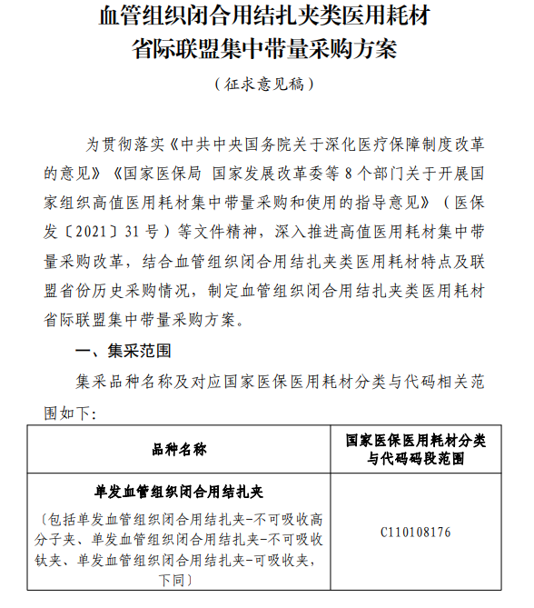 5月21日,福建省醫(yī)保局火速發(fā)布《血管組織閉合用結(jié)扎夾類醫(yī)用耗材省際聯(lián)盟集中帶量采購方案(征求意見稿)》(以下簡稱《征求意見稿》)(附文末),意見征求截止于5月28日。
