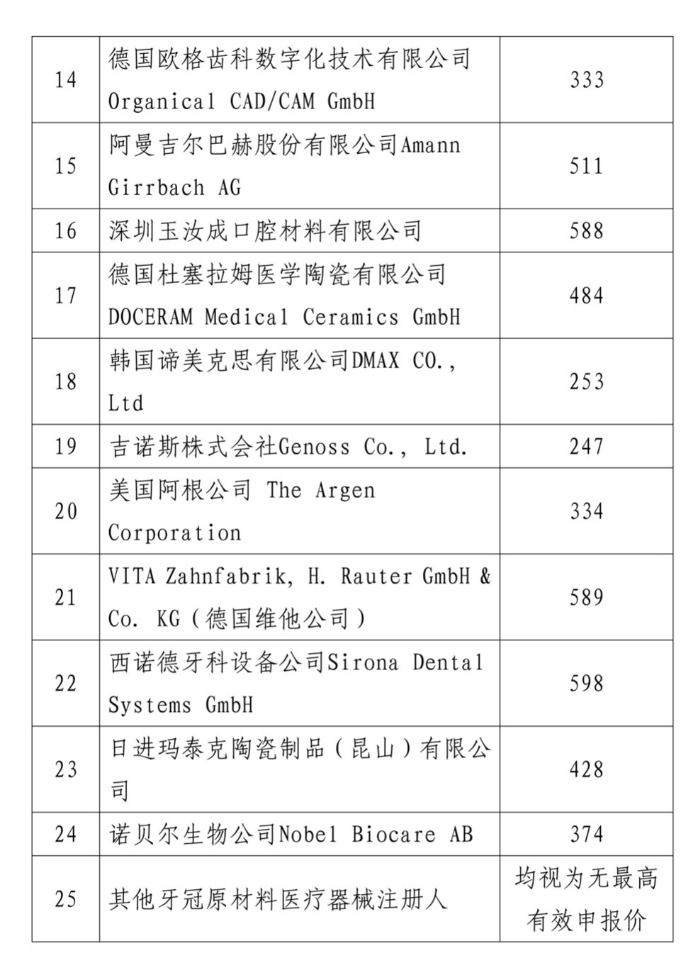 《通知》公布了各牙冠原材料醫療器械注冊人的最高有效申報價(見文末)。