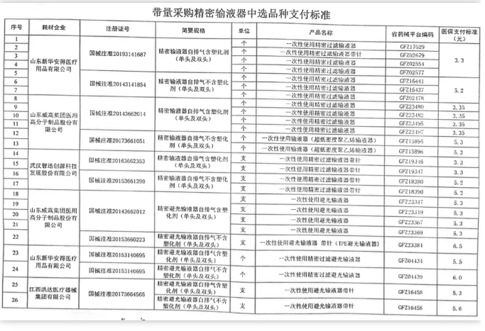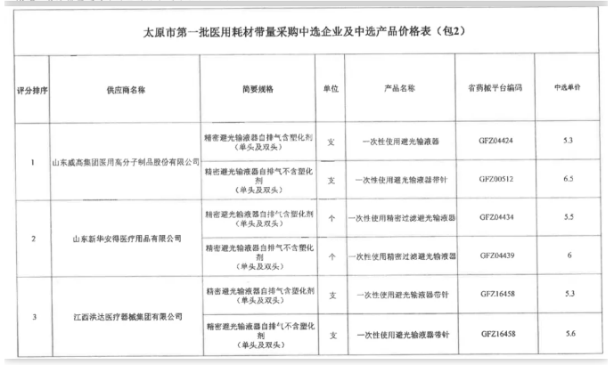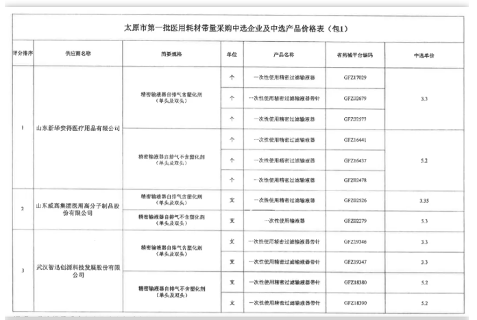 現(xiàn)將駐并醫(yī)療機構醫(yī)用耗材(第一批)集中帶量采購精密(避光)輸液器帶量采購結果共享其他公立醫(yī)療機構和民營醫(yī)療機構,各醫(yī)療機構自愿與中選企業(yè)簽訂采購協(xié)議并在省藥械平臺上進行采購。