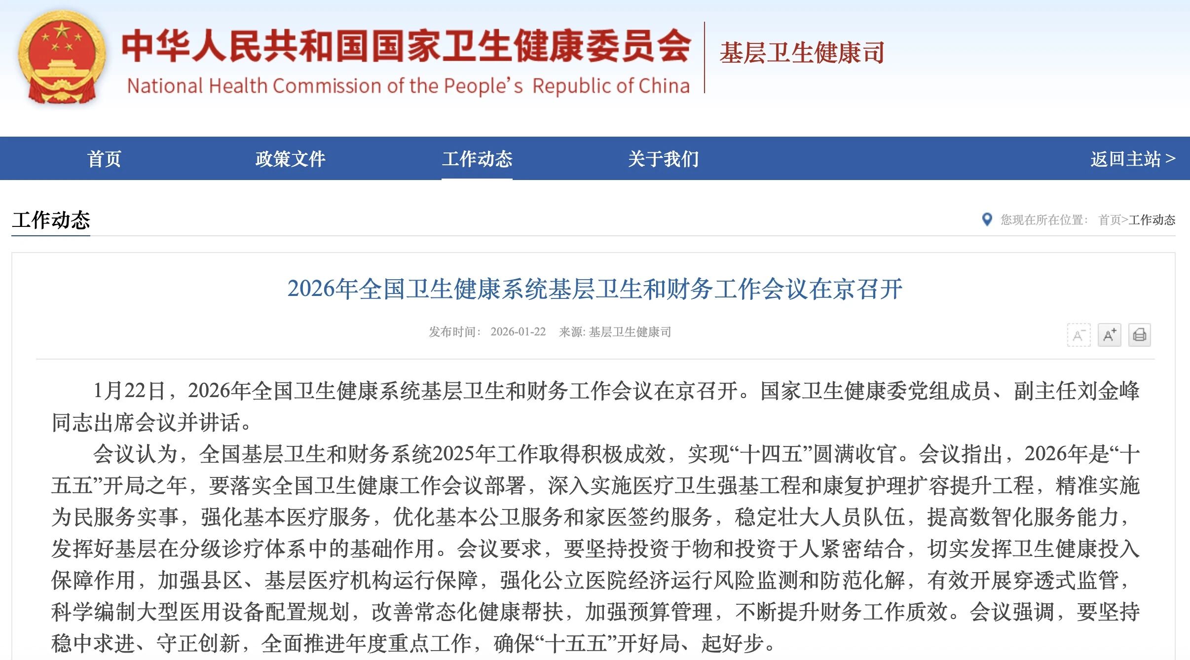 根據(jù)國家衛(wèi)健委消息,2026年全國衛(wèi)生健康系統(tǒng)基層衛(wèi)生和財務(wù)工作會議近日在北京召開,會議披露多項(xiàng)與醫(yī)療器械相關(guān)的重點(diǎn)任務(wù)。