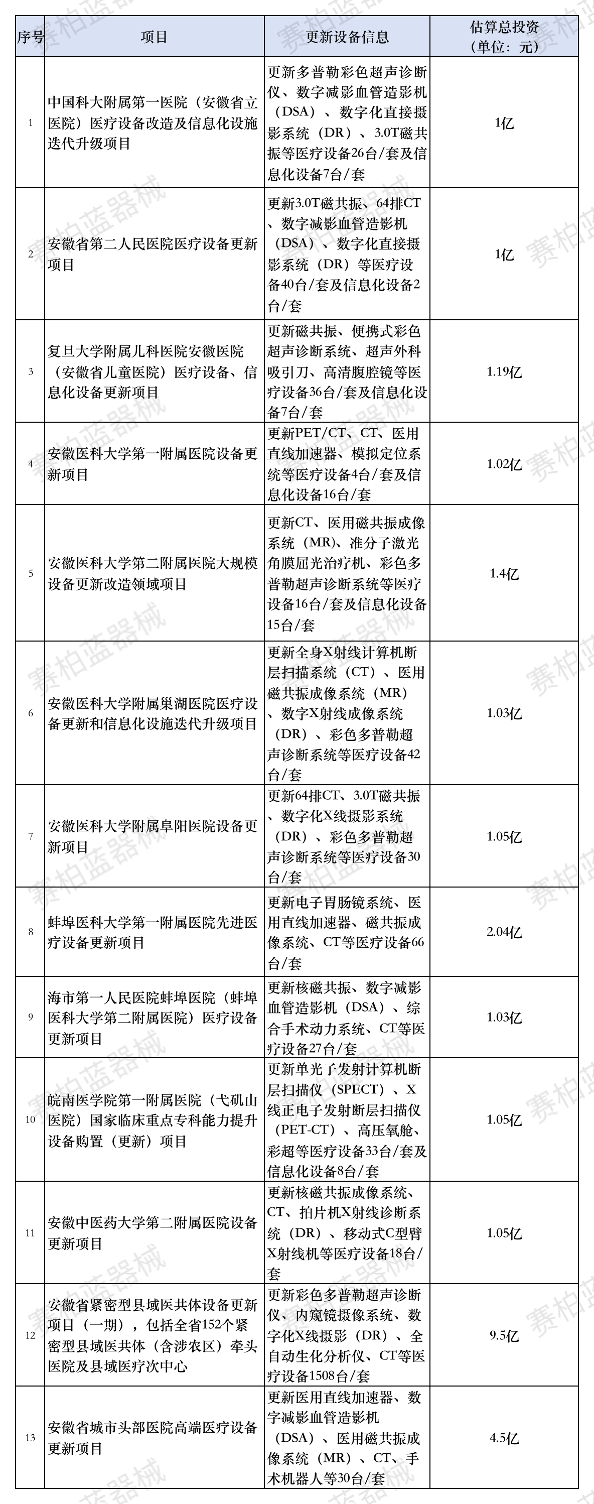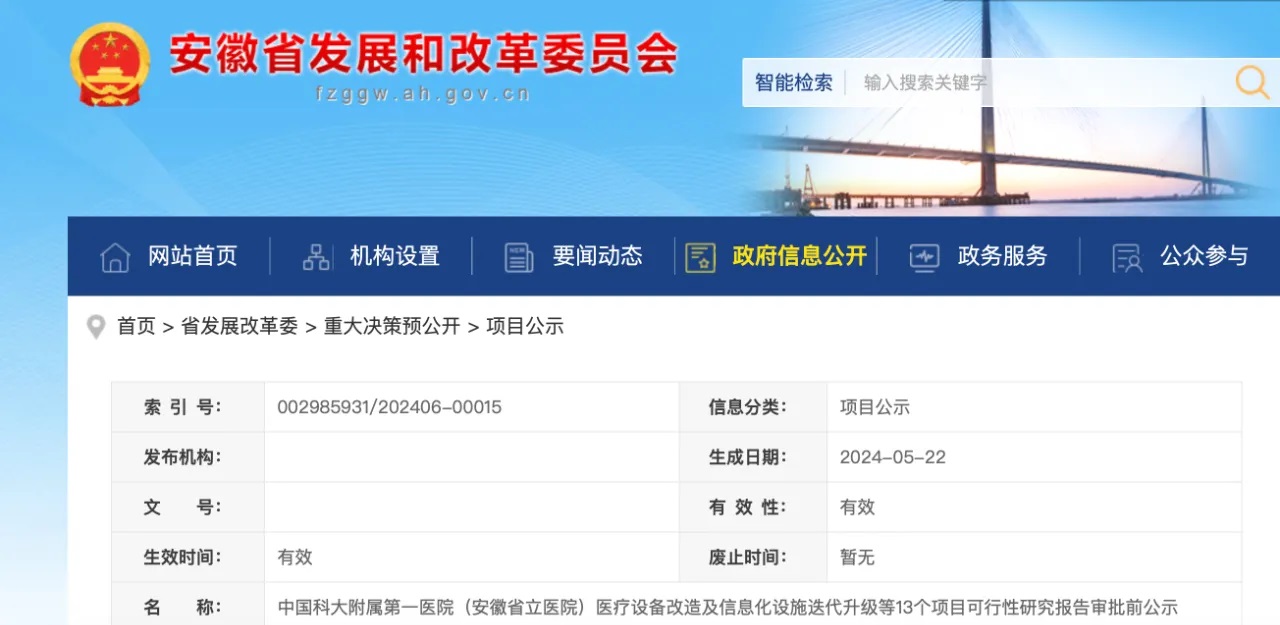 除廣東以外,安徽省發改委近期發布《中國科大附屬第一醫院(安徽省立醫院)醫療設備改造及信息化設施迭代升級等13個項目可行性研究報告審批前公示》,估算總投資約為26.86億元。