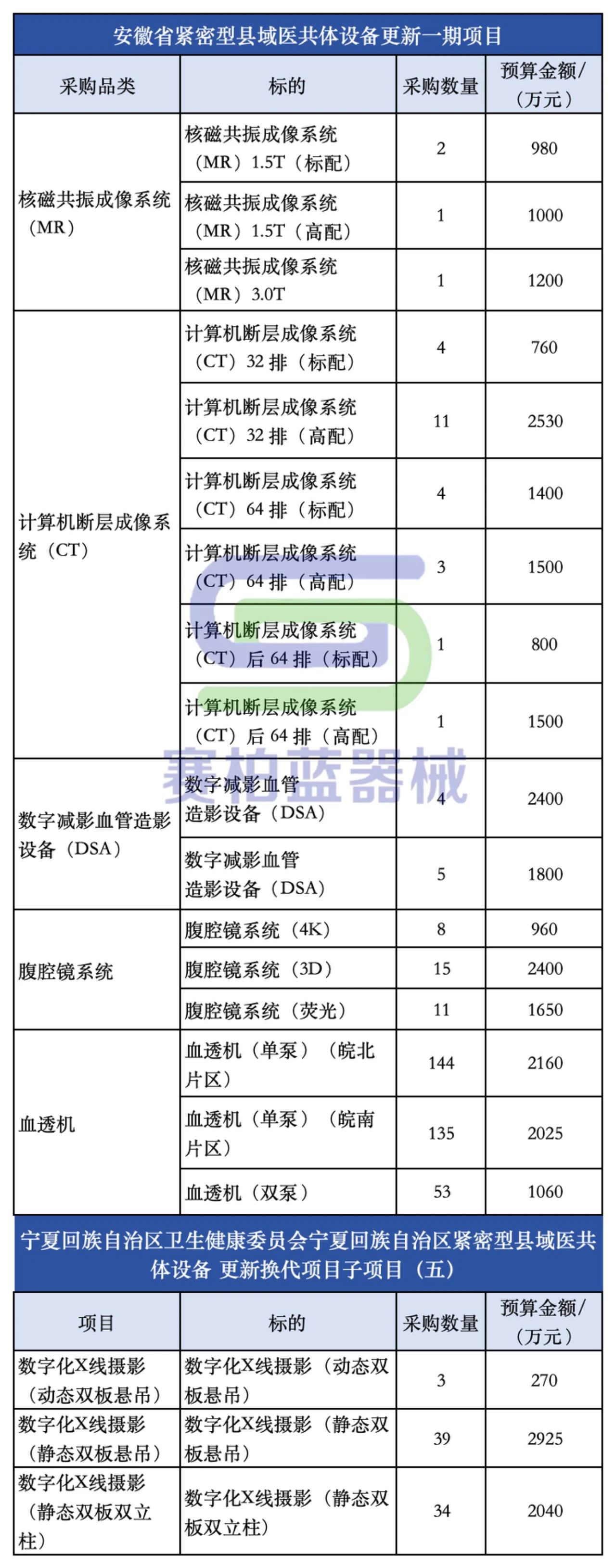 安徽此輪將采購CT、DSA、MR、腹腔鏡系統、血透機等共計403臺醫療設備,總預算約2.61億元。