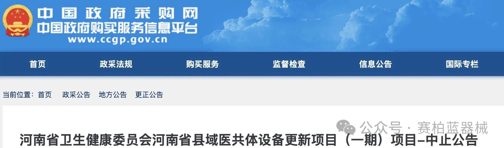 近日,中國政府采購網發布《河南省衛生健康委員會河南省縣域醫共體設備更新項目(一期)項目-中止公告》(簡稱《公告》)。