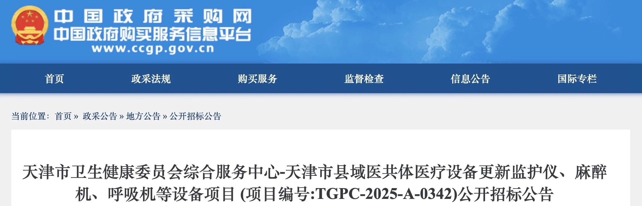近日,中國政府采購網發布《天津市縣域醫共體醫療設備更新監護儀、麻醉機、呼吸機等設備項目的公開招標公告》(簡稱《公告》)。