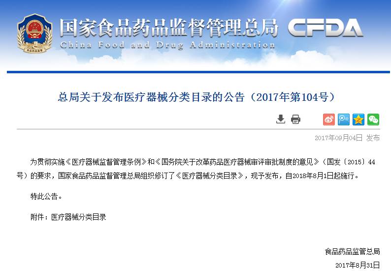 距CFDA發(fā)布新版《醫(yī)療器械分類(lèi)目錄》過(guò)去了將近1年的緩沖時(shí)間,按照之前的公示:新版《醫(yī)療器械分類(lèi)目錄》將在2018年8月1日正式實(shí)施。