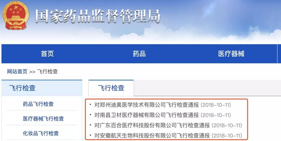 根據通報,4家被飛檢的公司分別是鄭州迪奧醫學技術有限公司、南昌衛材醫療器械有限公司、廣東百合醫療科技股份有限公司、安徽航天生物科技股份有限公司。