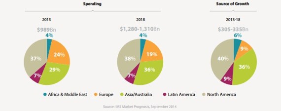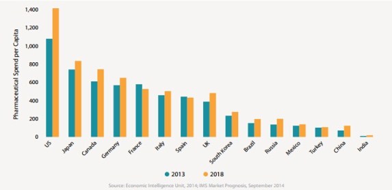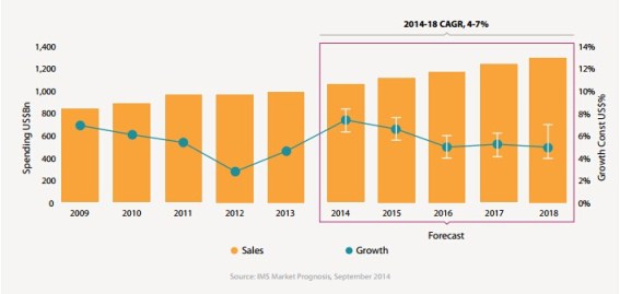 IMS預測,到2018年,全球處方藥銷售將達到1.3萬億美元。這一數字高過2014年世界第15大經濟體墨西哥的GDP1.2萬億美元。