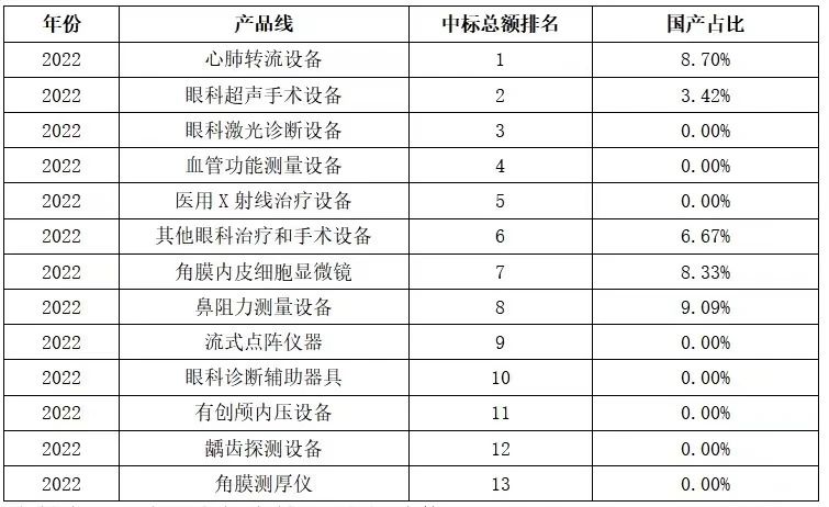 據(jù)眾成數(shù)科統(tǒng)計,在2022年我國國產(chǎn)產(chǎn)品公開中標金額低于10%的產(chǎn)品共有13項,相比較去年減少了2個。從具體產(chǎn)品線來看,心肺流轉(zhuǎn)設備中標金額位居首位,眼科超聲手術設備和眼科激光診斷設備分居第二、三位。