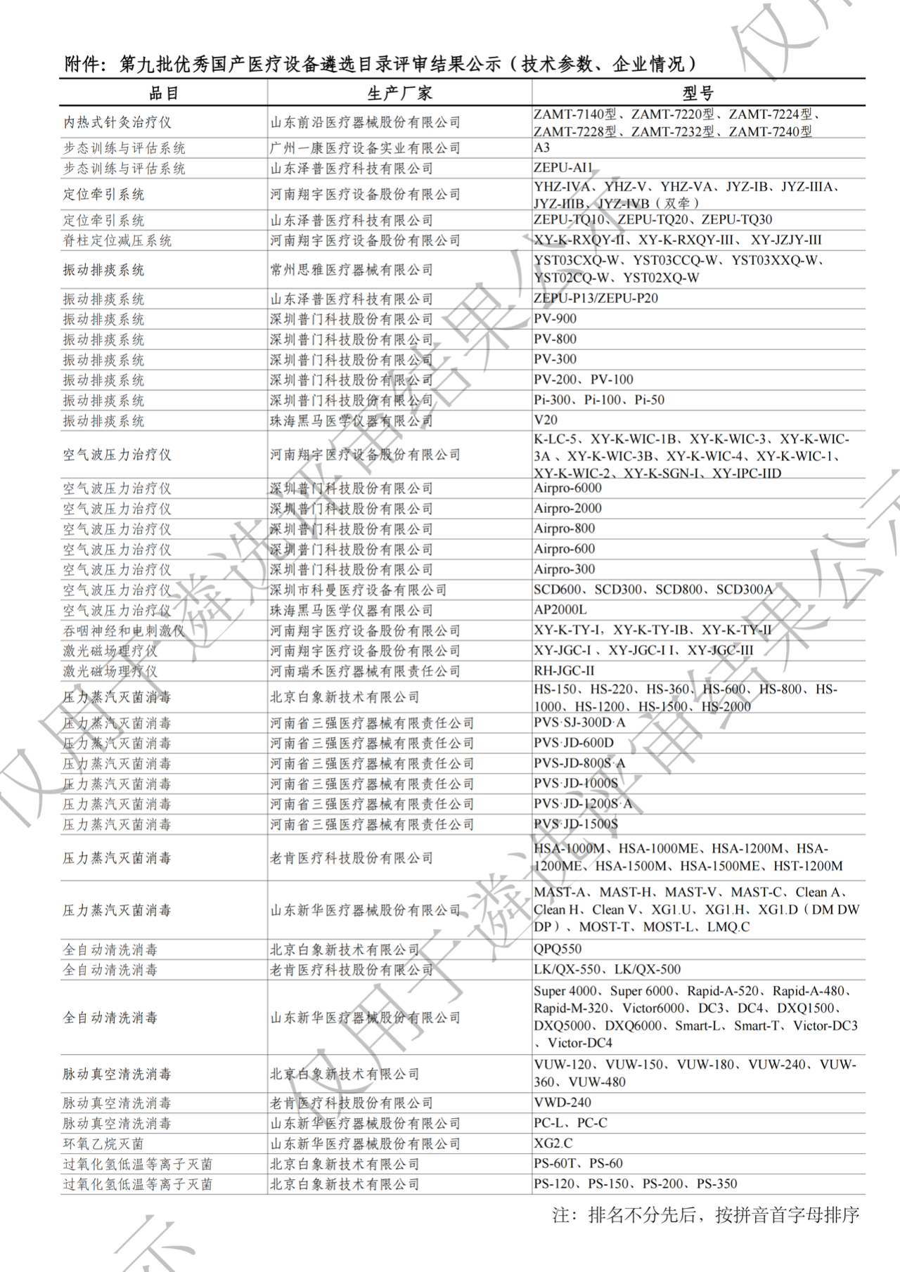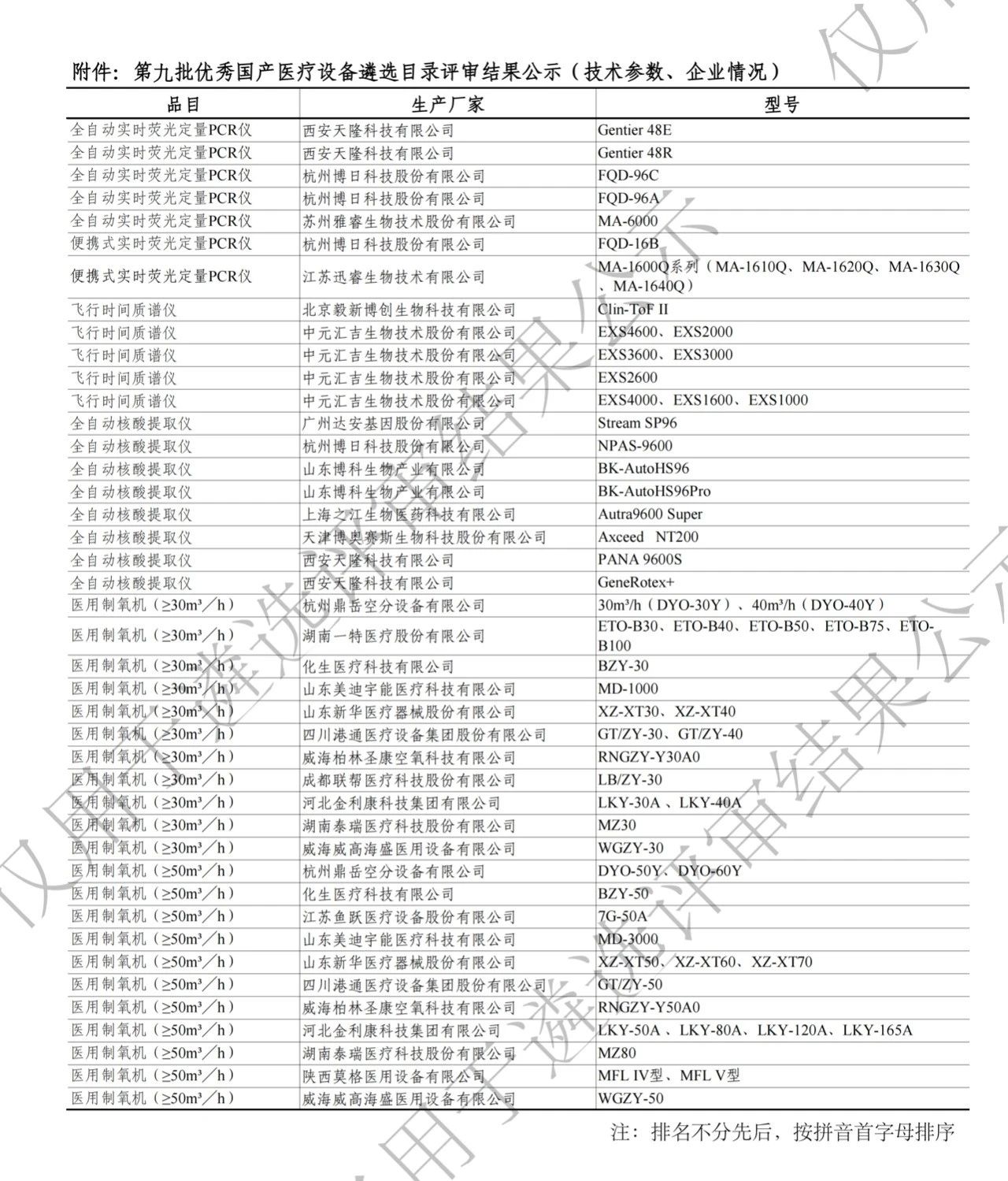 心電圖機(12-CH)、動態(tài)心電圖機(Holter)、醫(yī)用電子直線加速器、γ-射線立體定向治療系統(tǒng)、高強度聚焦超聲腫瘤治療系統(tǒng)、數(shù)字減影血管造影(DSA)設備、清洗消毒設備(壓力蒸汽滅菌消毒、全自動清洗消毒、脈動真空清洗消毒、環(huán)氧乙烷滅菌、過氧化氫低溫等離子滅菌、軟式內(nèi)鏡清洗消毒、翻蓋式全自動軟式內(nèi)鏡清洗消毒、超聲波清洗)、化學發(fā)光免疫分析儀(全自動、小型全自動、單人份、便攜式4個子品目)、全自動酶聯(lián)免疫分析儀(微板)、冷凍消融設備(腫瘤)、超聲骨刀、SPECT、數(shù)字胃腸X線機、口腔CT設備、心肺復蘇機、醫(yī)用制氧機、超聲光散射乳腺診斷系統(tǒng)、康復設備(定位牽引系統(tǒng)、振動排痰系統(tǒng)、吞咽神經(jīng)和電刺激儀、空氣波壓力治療儀、激光磁場理療儀、脊柱定位減壓系統(tǒng))、眼底照相機、飛行時間質(zhì)譜儀、實時熒光定量PCR儀(全自動、便攜式)、全自動核酸提取儀、全自動血型分析儀。