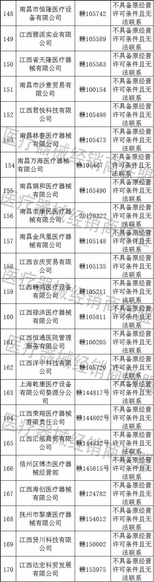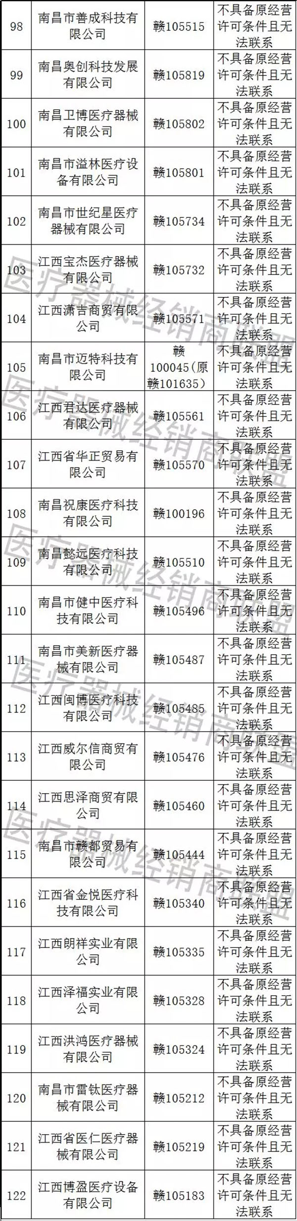 南昌市百康如貿(mào)易有限公司等87家企業(yè)不具備原經(jīng)營(yíng)許可條件且無(wú)法聯(lián)系。