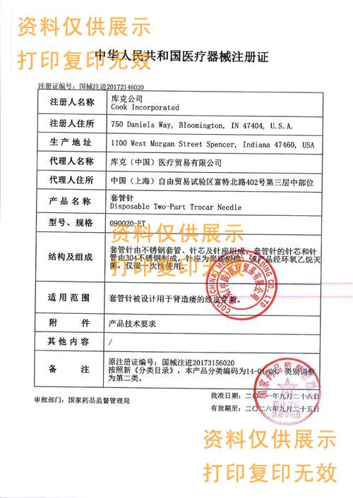 美國cook套管針用于B超或X-射線導引下,經皮腎臟穿刺導入腎造瘺器械或其他治療器械,進行腎盂引流或建立進入腎盂的通道。