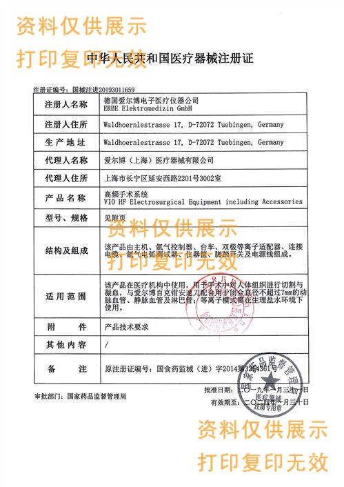 由VIO系列高頻電外科系統主機和可供選配的氬等離子體凝固器(俗稱氬氣控制器)、VIO臺車、儀器筐、雙極等離子適配器及連接電纜、氬氣電弧測試器、單極連接電纜、雙極連接電纜、腳踏開關和電源線組成。具有單極電切、單極電凝、雙極電切、雙極電凝、氬等離子凝固、大血管閉合以及鹽水下等離子切割功能。具體型號、輸出模式及參數見附頁。